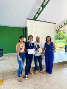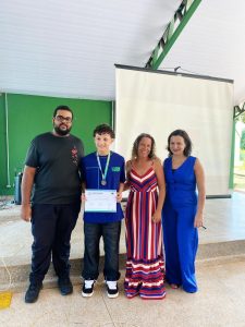 A diretora, Cleide de Oliveira Silva, o aluno José Henrique de Souza Semensato, e seu pai, Cristiano Semensato, irão participar da cerimônia da entrega dos prêmios em Brasília, no próximo dia 19, com tudo custeado pela OLITEF.
