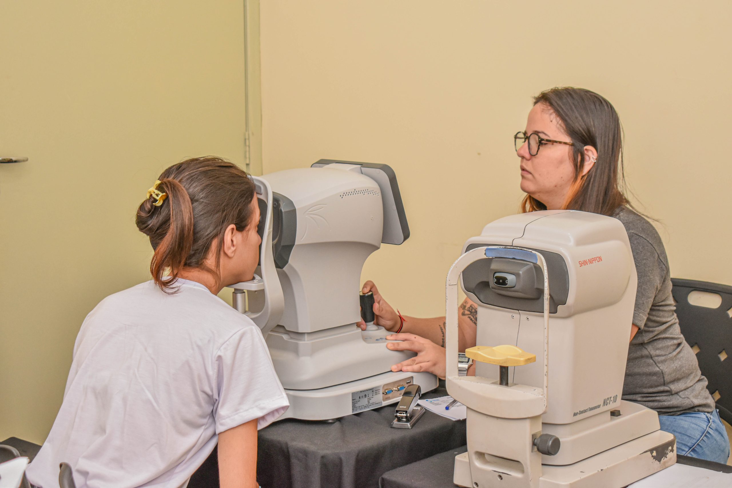 No mutirão estão sendo realizados exames de acuidade visual, refração completa, movimentos oculares, fundo de olho, biomicroscopia, pressão intraocular, ceratometria, curva tensional e teste do olhinho.