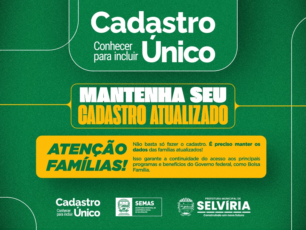 A Secretaria reforça a importância de as famílias manterem seus dados atualizados no Cadastro Único. A atualização deve ser feita a cada dois anos ou sempre que houver qualquer alteração na composição familiar, como mudança de endereço, telefone, escola, renda mensal, estado civil, nascimento, adoção ou falecimento de algum integrante.