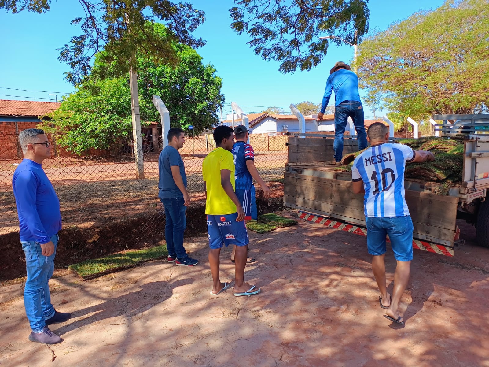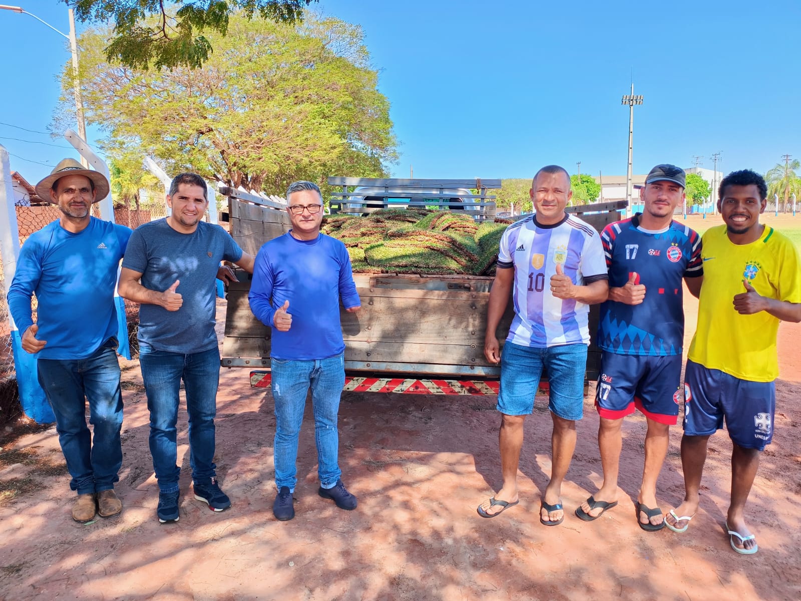 A entrega do material foi acompanhada pelo secretário de Esportes e Lazer, Sérgio Bezerra Leite, e pelo vereador Aristides Pinheiro Bastos Jr, o Juninho, o secretário adjunto de Esporte, Carlos Adriano (Profº Formiga), Rodrigo Helder De Brito Da Costa (Digão) e Elton Jones (Buxinho). O novo gramado será plantado, principalmente, nas áreas mais desgastadas, como a região central dos gols e outros trechos onde a grama já estava queimada.