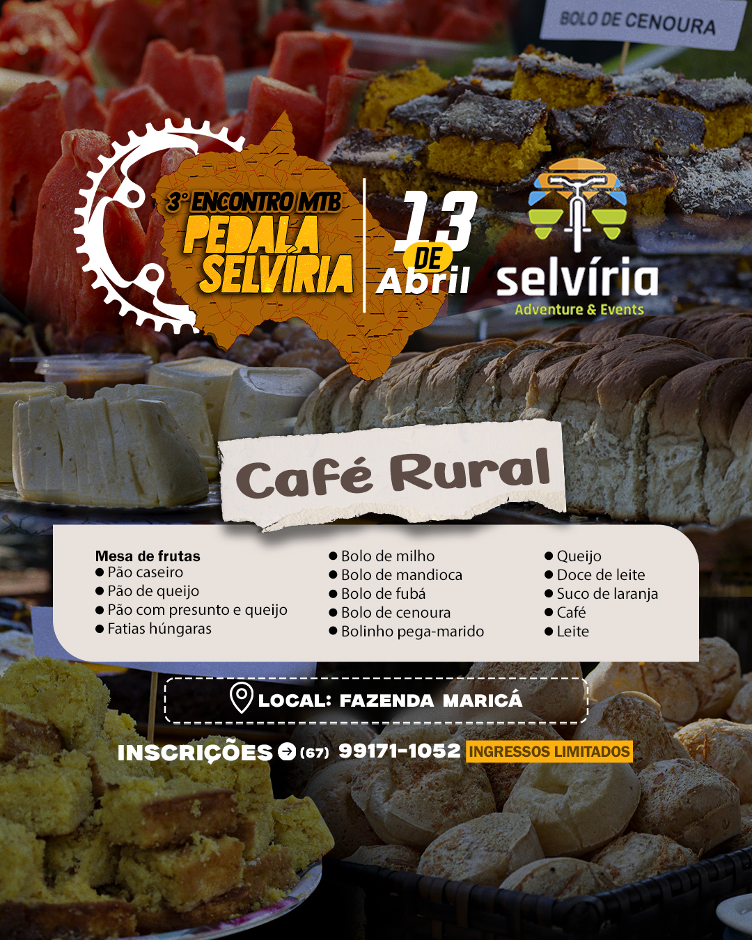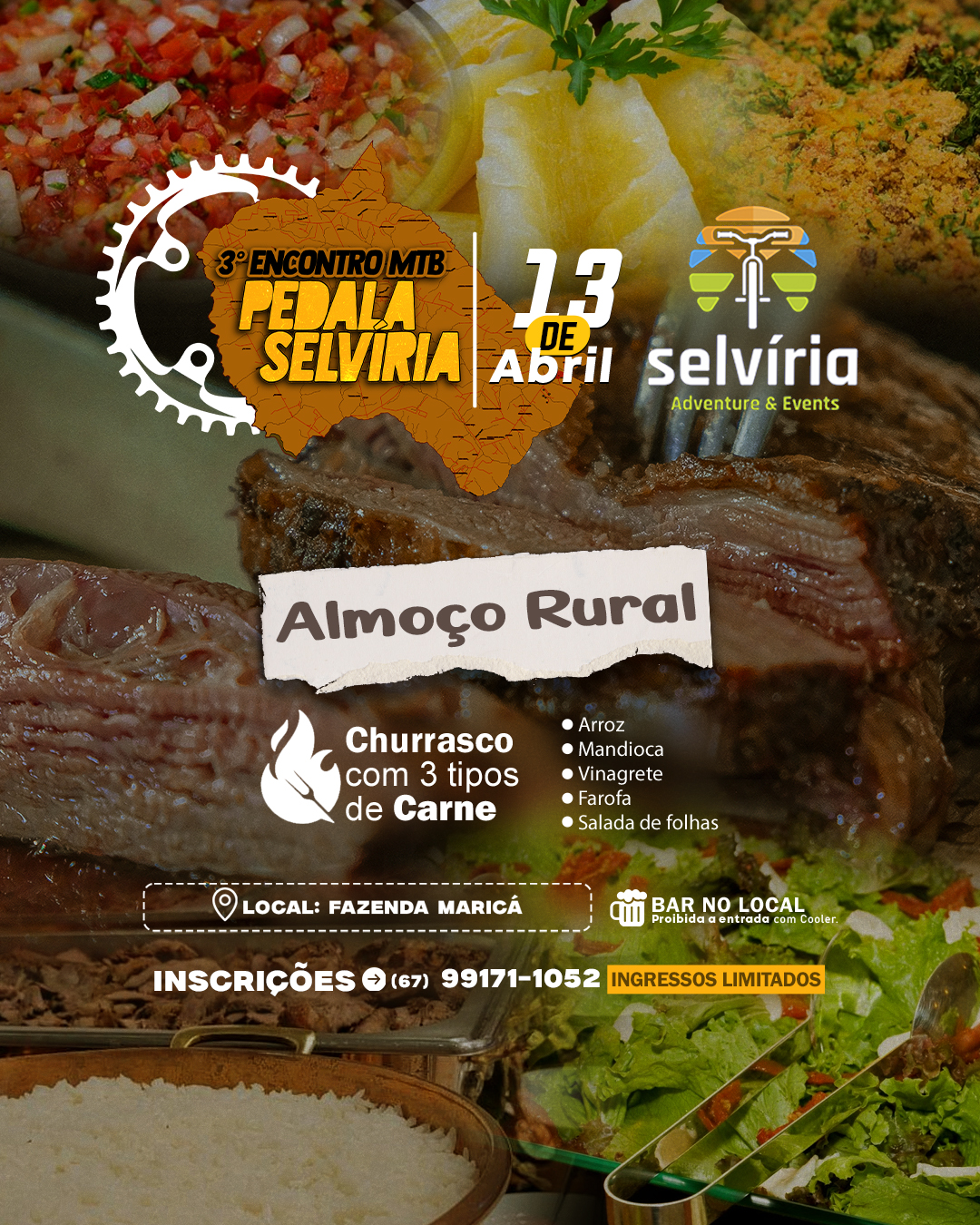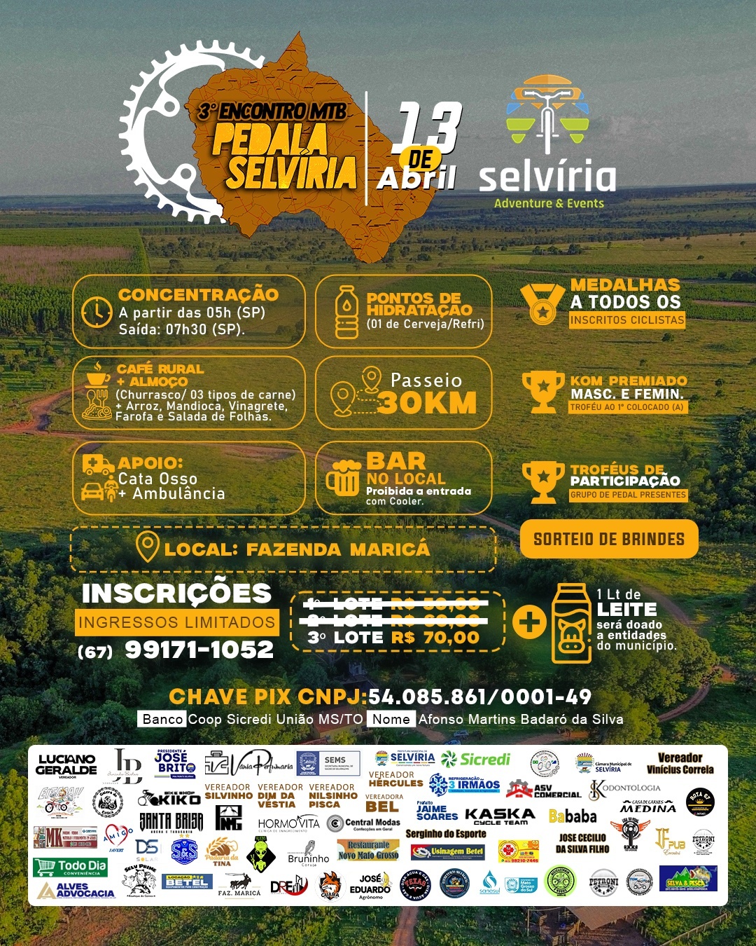 Continuam abertas as inscrições para a terceira edição do “Encontro MTB Pedala Selvíria”, que será realizado no dia 13 de abril, em Selvíria. Mas corre que elas já estão acabando. A realização é do Selvíria Adventure e Eventos.
