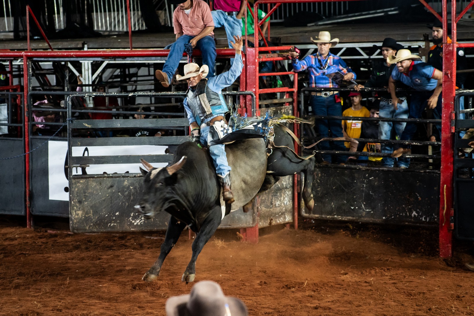 Na arena, mais de trinta peões disputaram a primeira etapa do rodeio em touros. Nesta quinta (9), a partir das 21h, a disputa continua.