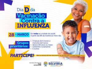 A Prefeitura de Selvíria, por meio da Secretaria Municipal de Saúde, realiza neste sábado, 28 de março, o “Dia D” de vacinação contra a gripe. A ação é destinada exclusivamente aos grupos prioritários definidos pelo Ministério da Saúde.